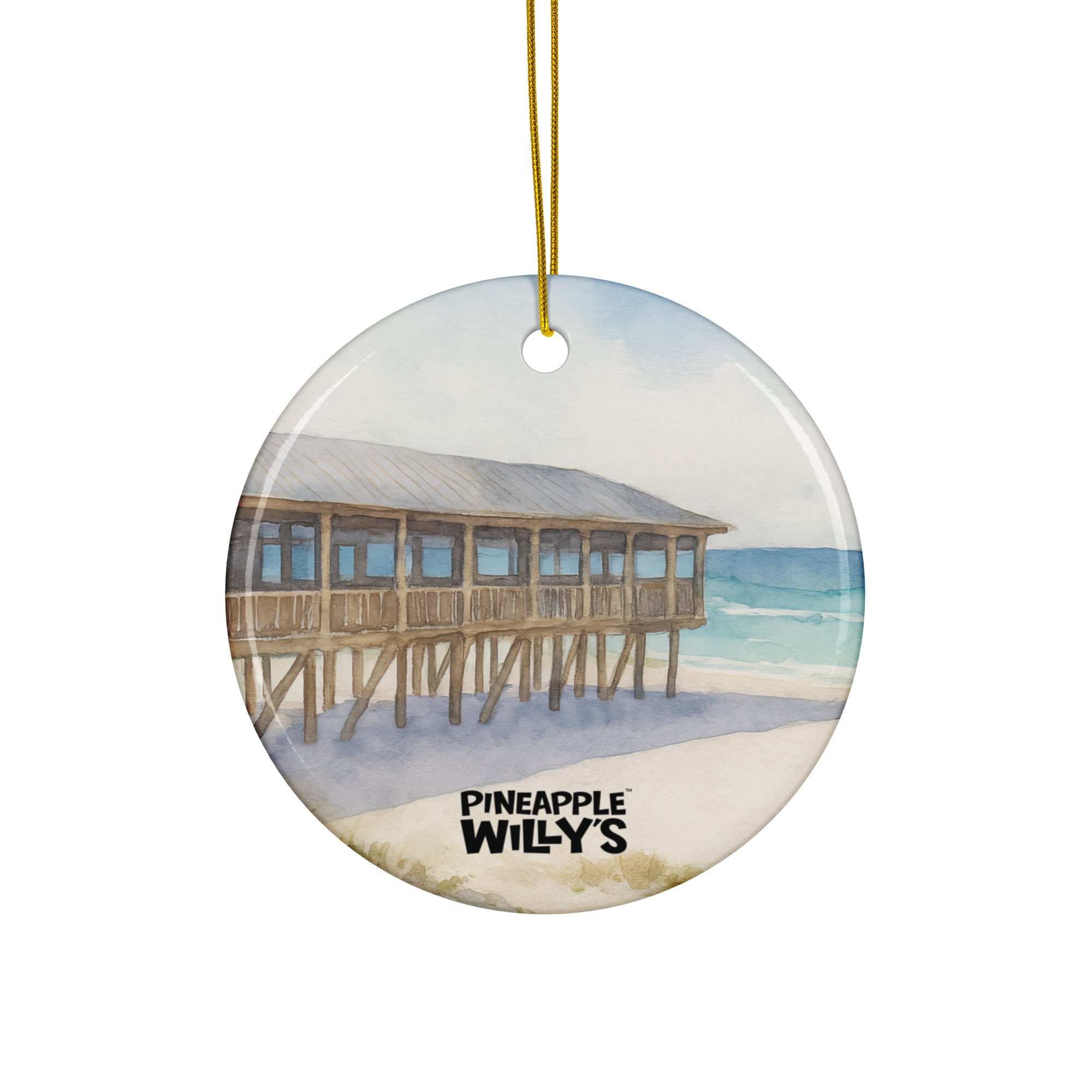 Celebrate the season with a touch of coastal nostalgia. This glossy ceramic ornament features the watercolor artwork of Pineapple Willy’s iconic pier, making it a perfect keepsake for your tree or a thoughtful gift for anyone who loves Panama City Beach. Finished with an elegant gold-toned string, it’s a festive way to keep your favorite beach memories close all year long.